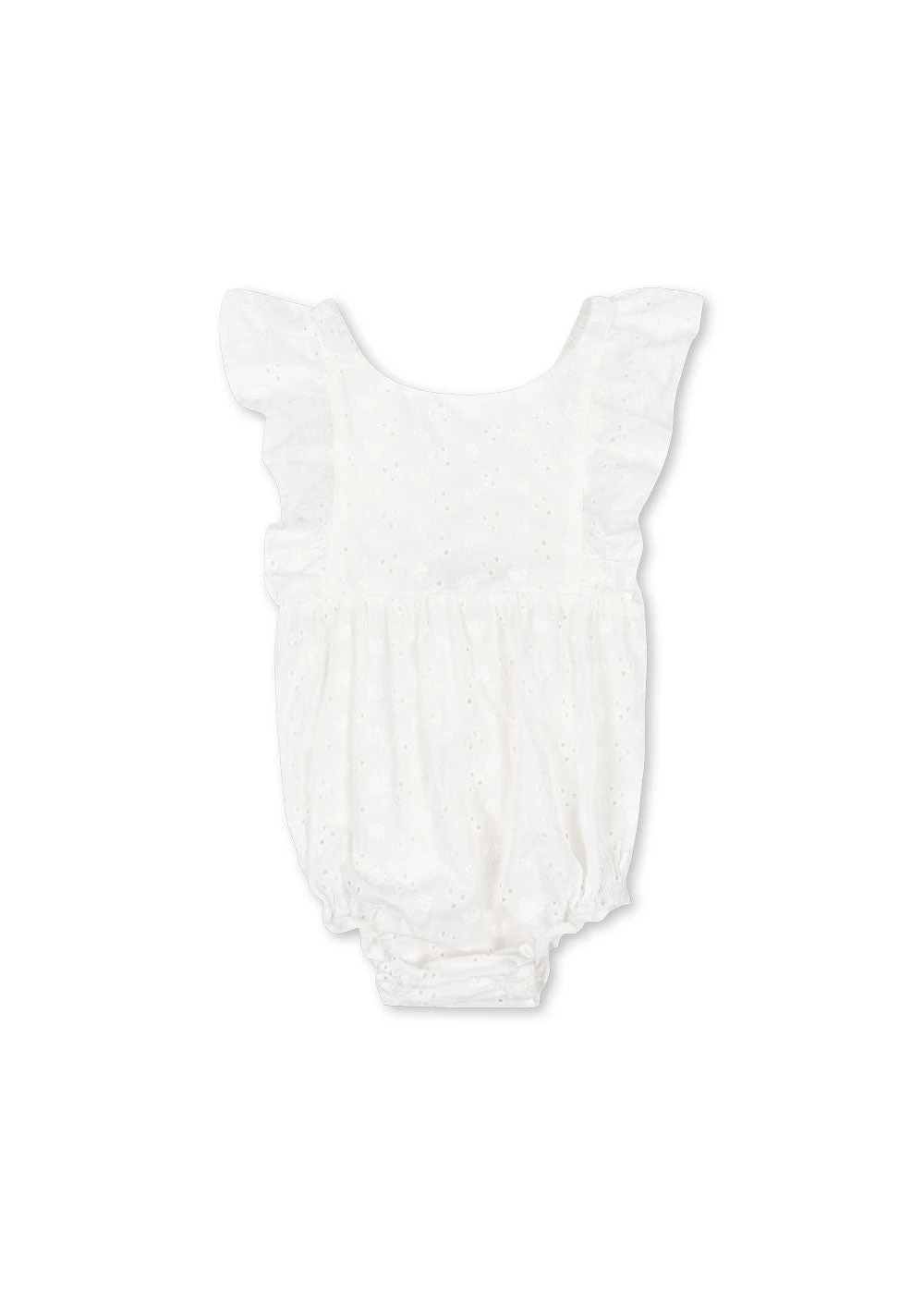 Barboteuse sans manches en broderie anglaise classique avec des volants le long des épaules et des cuisses. Conçue avec des bretelles croisées dans le dos et des boutons-pression à l’entrejambe pour faciliter l’habillage.