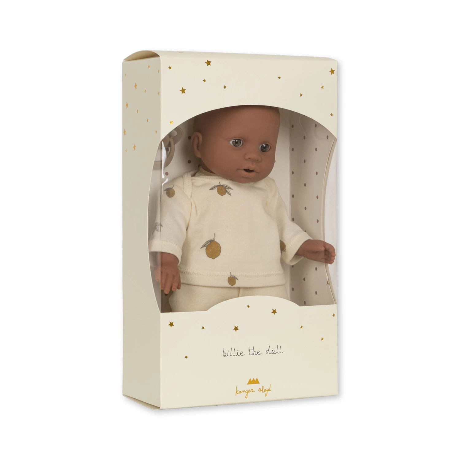 Notre poupée Billie est fabriquée en vinyle et en coton biologique, avec un rembourrage en polyester recyclé. Billie est livrée avec sa propre tétine.