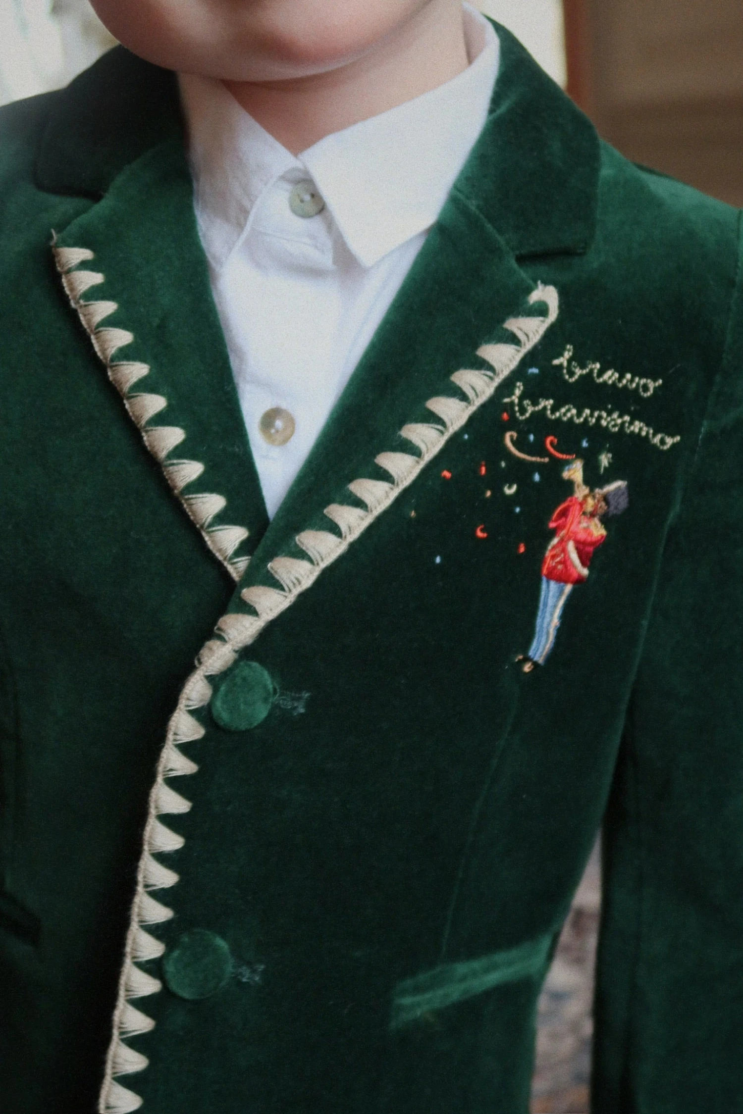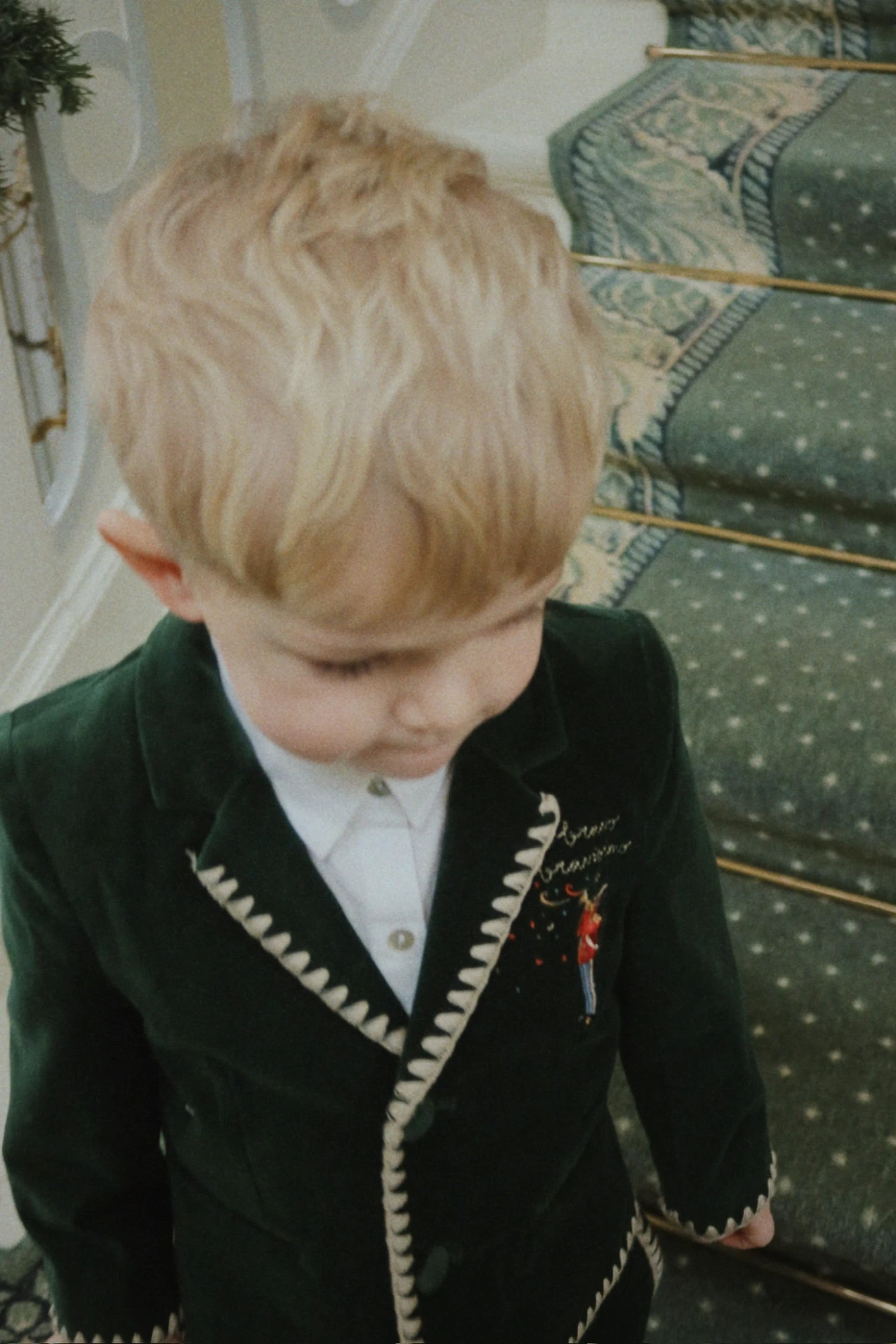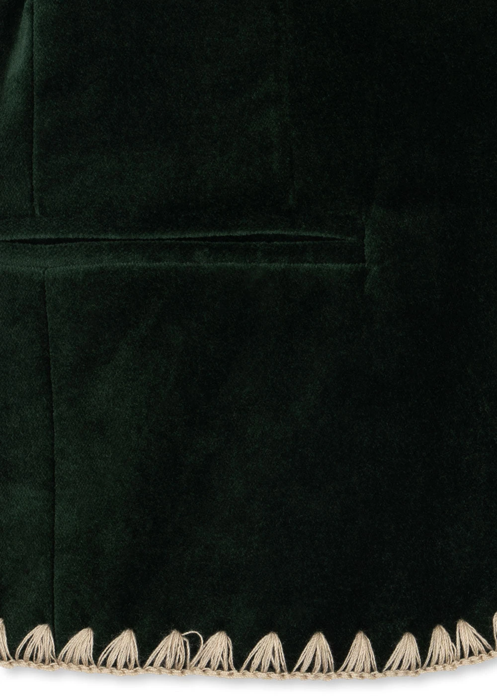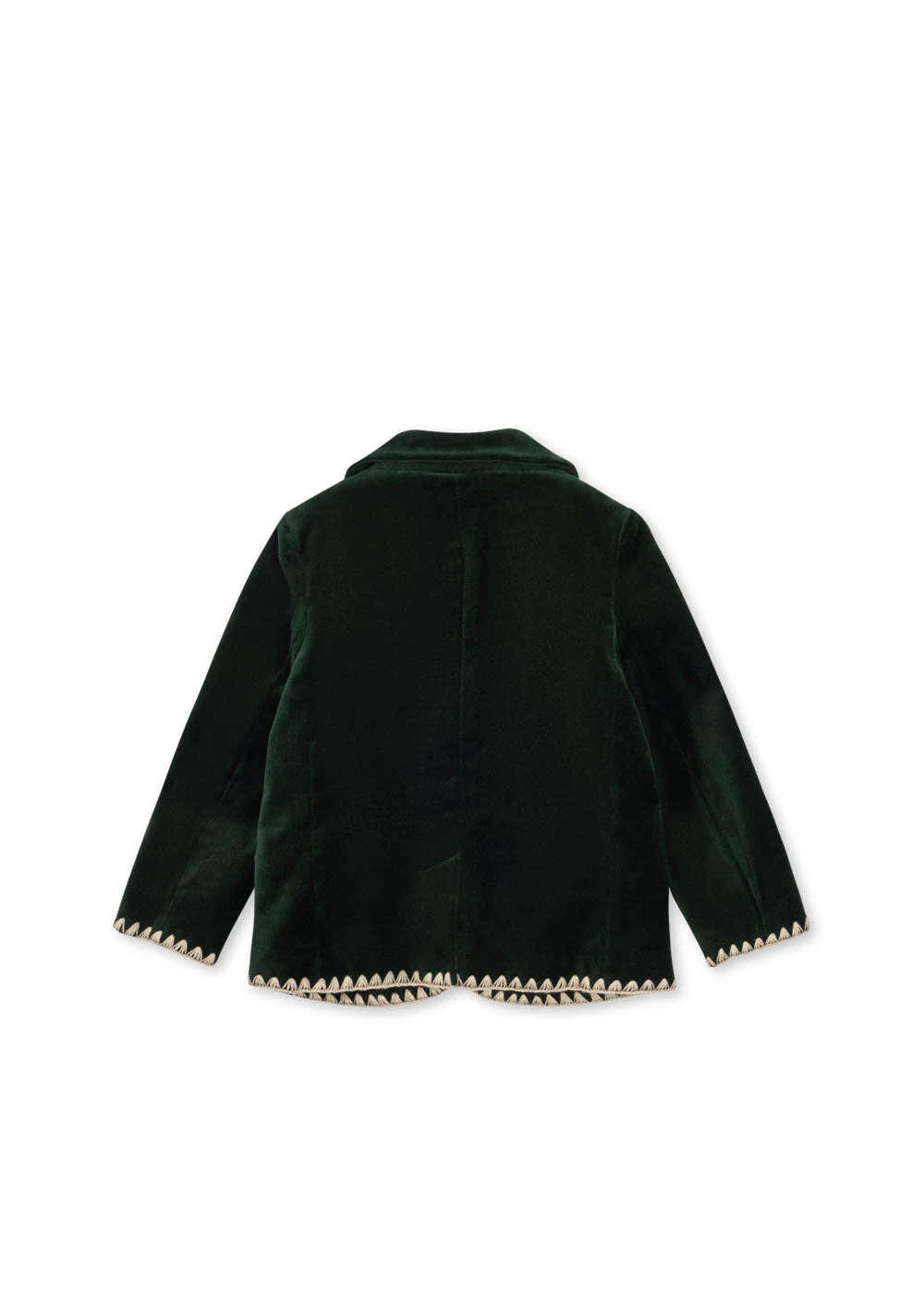 Blazer en velours doux aux détails intemporels. Revers classiques, fermeture à boutons, poches passepoilées et surpiqûres contrastées blanches décoratives.