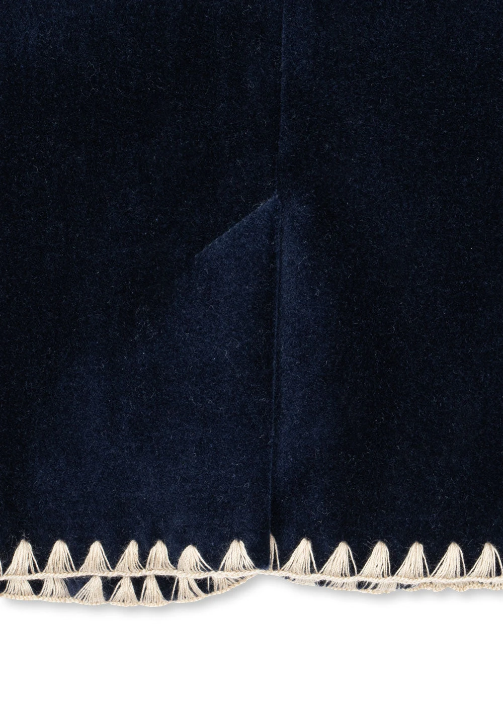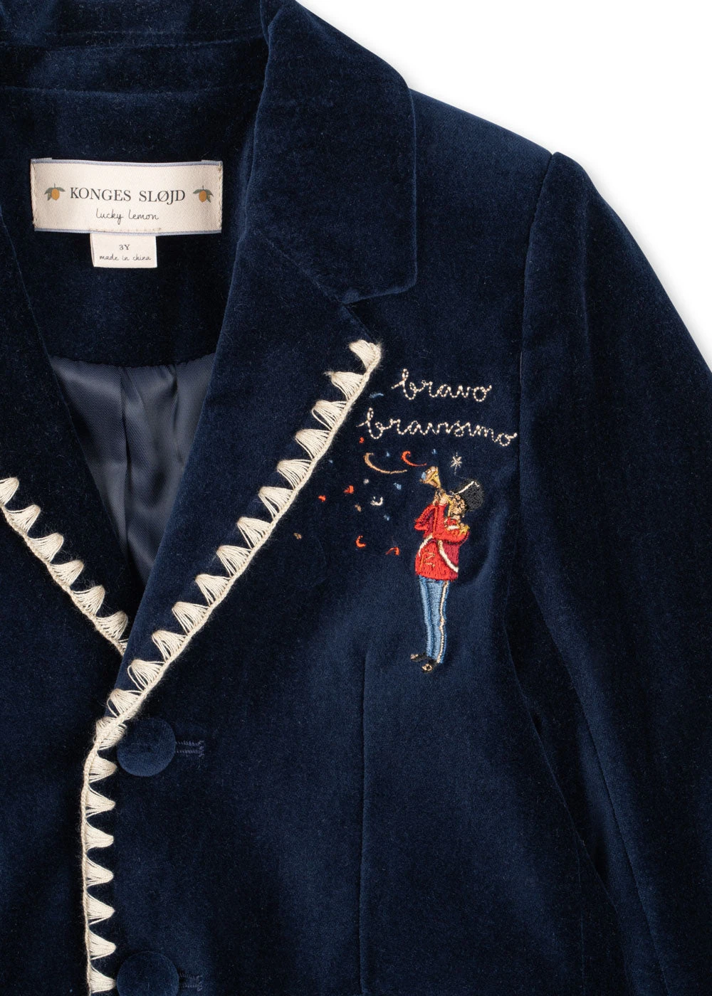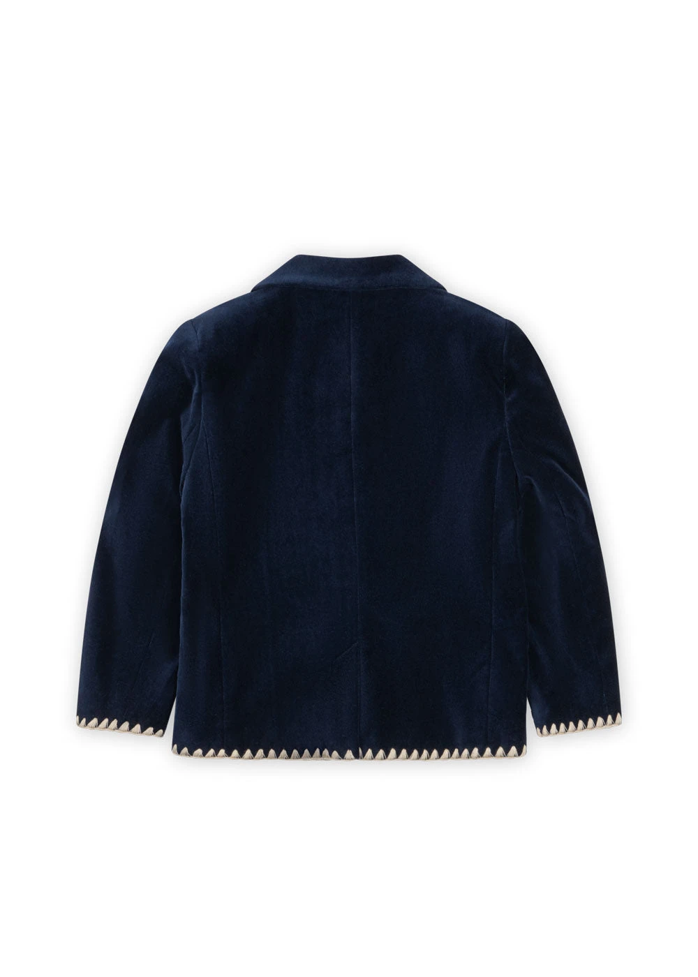 Blazer en velours doux aux détails intemporels. Revers classiques, fermeture à boutons, poches passepoilées et surpiqûres contrastées blanches décoratives.