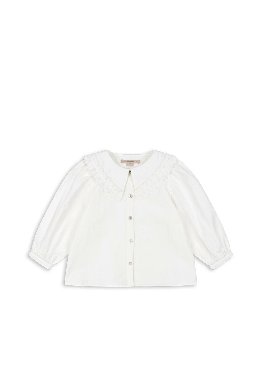 Chemisier avec col rond classique, jupe péplum et manches bouffantes. Boutons recouverts de tissu sur le devant et poignets froncés.