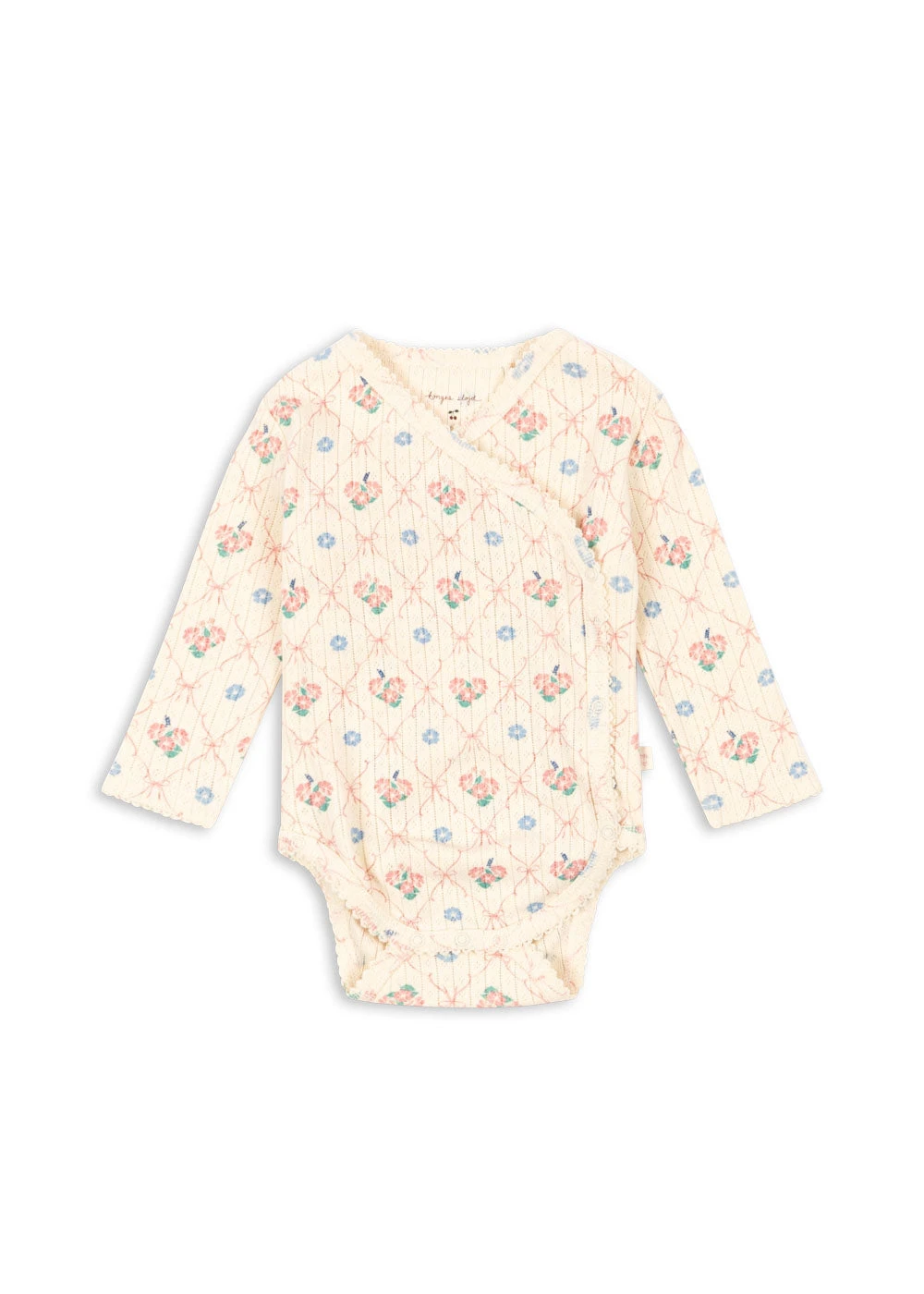 Body doux avec un motif pointelle décoratif et une fermeture cache-cœur. Boutons-pression le long du body et à l’entrejambe pour un enfilage facile.