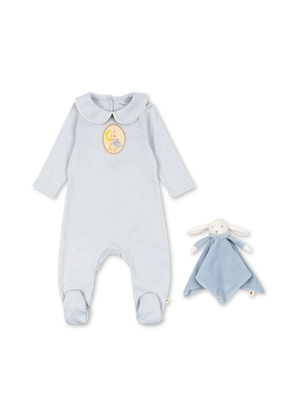 Un coffret cadeau attentionné avec Une grenouillère en coton avec pieds et un ourson tout doux à câliner. Ce coffret cadeau est présenté dans une jolie boîte de rangement.