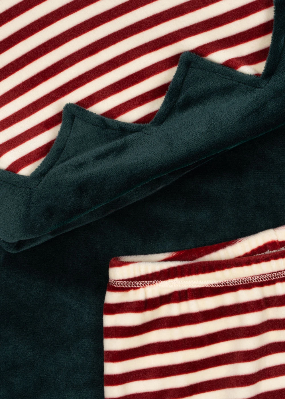 Costume trois pièces tout doux pour petits lutins. Confectionné en velours pelucheux, il comprend une blouse, un pantalon assorti et un chapeau de lutin.