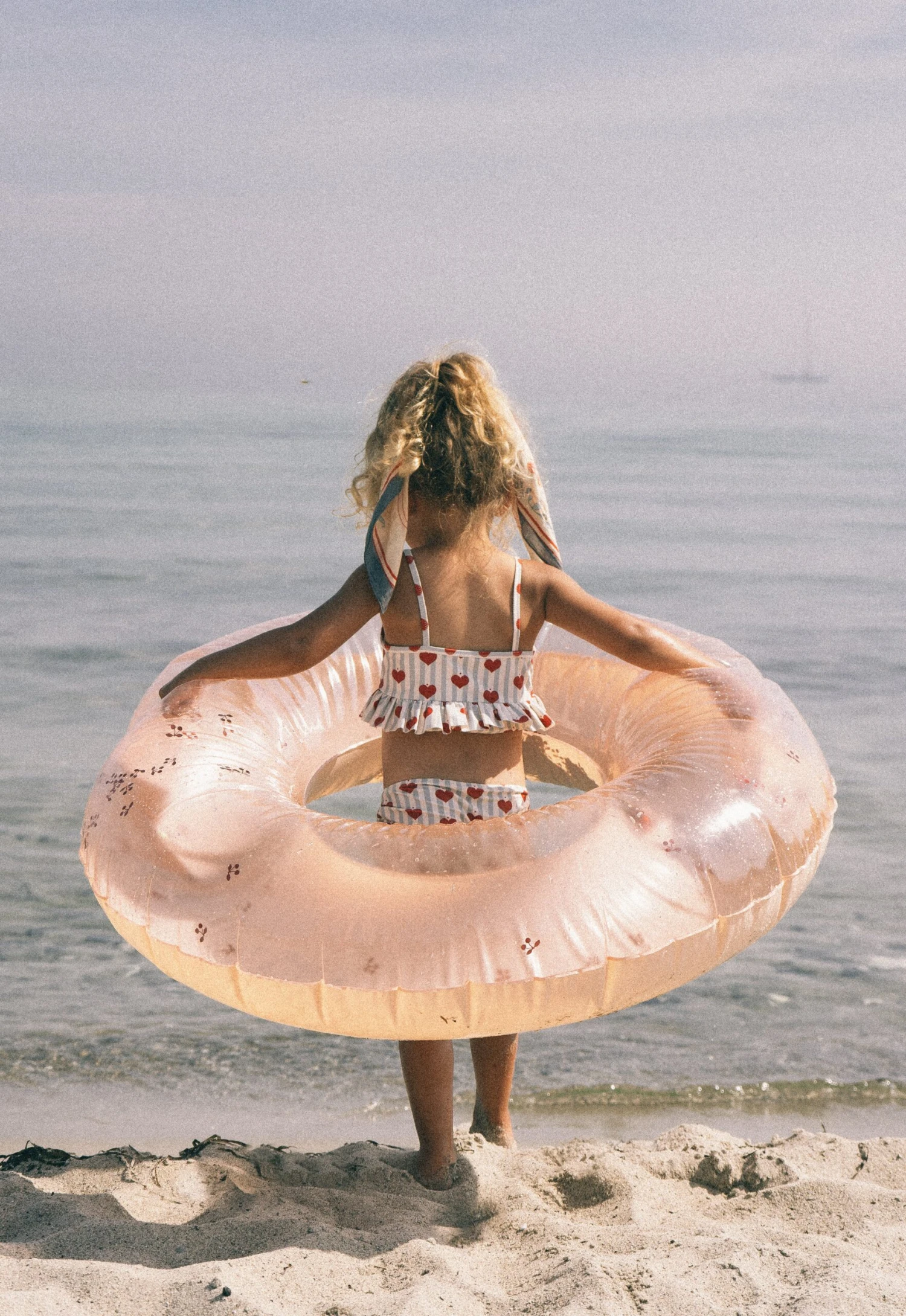 Bouée gonflable transparente en PVC résistant et remplie de paillettes.