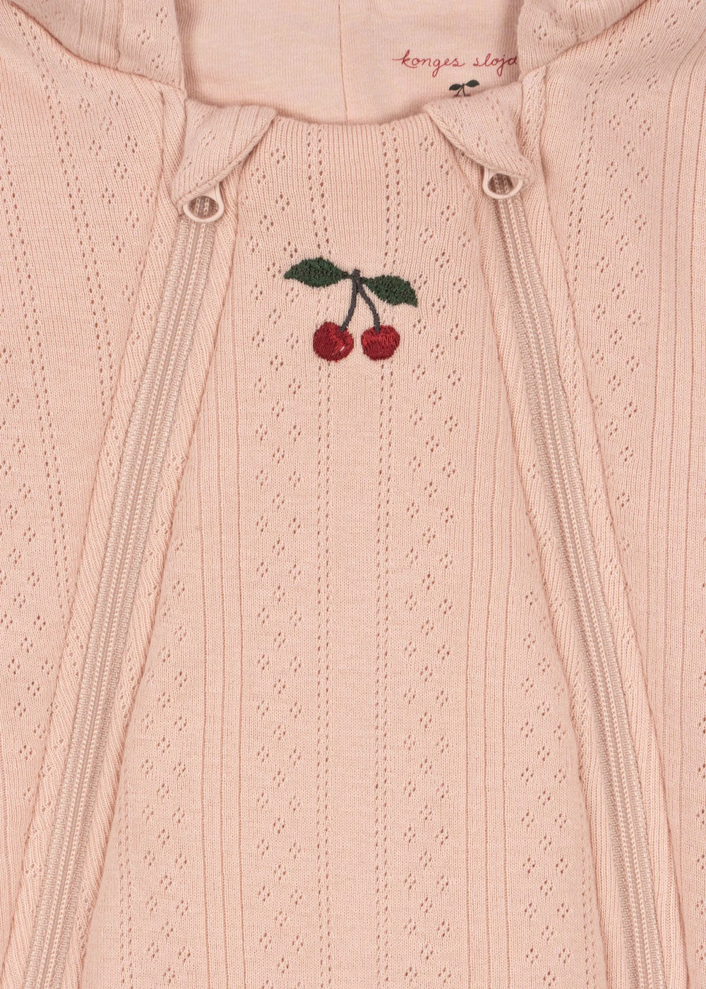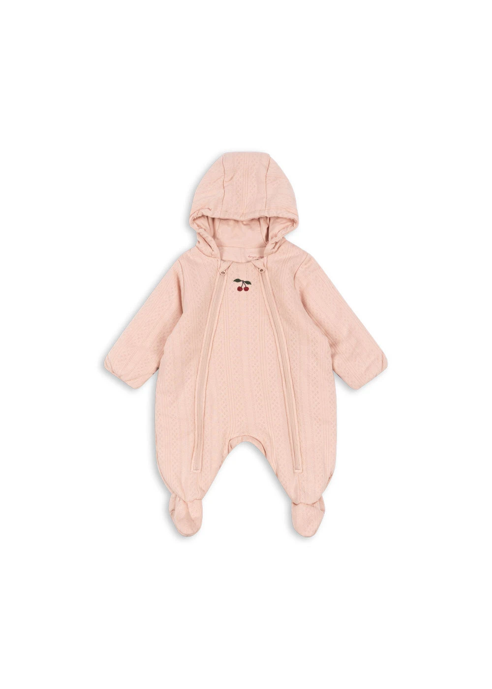 Combinaison matelassée en pointelle décorative. Conçue avec une capuche et protection pour les pieds. Se ferme à l’aide de deux fermetures éclair sur le devant.