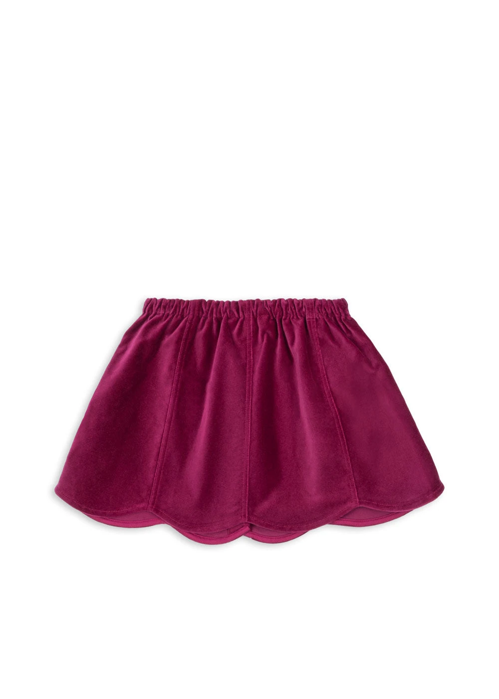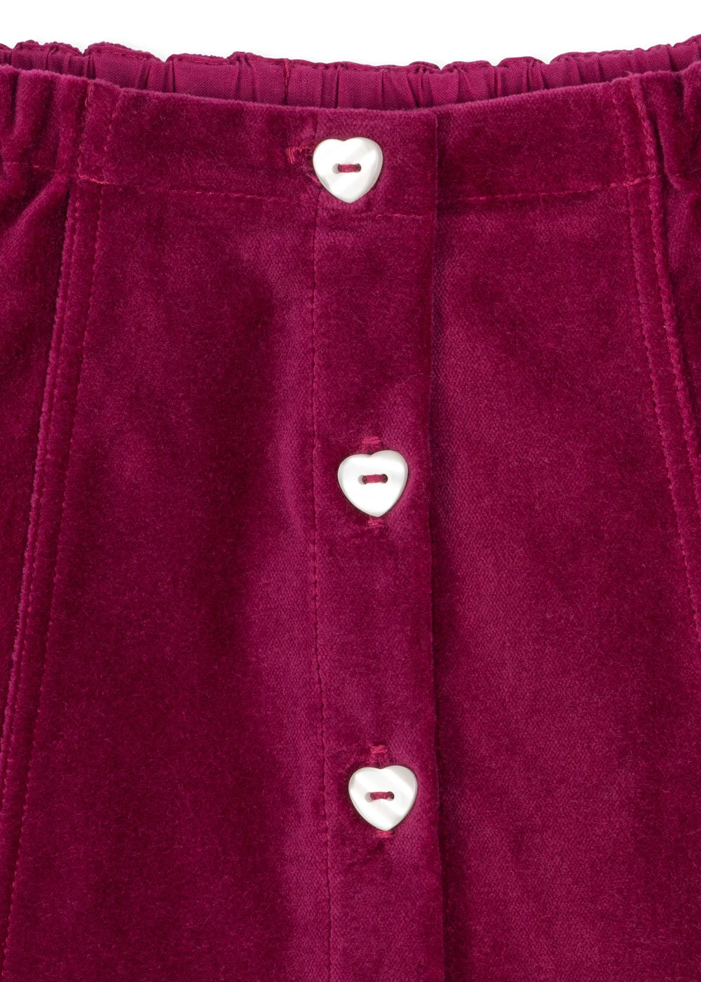 Jupe douce en velours épais qui sublime la silhouette. Boutons en forme de cœur sur le devant et ourlets festonnés décoratifs.
