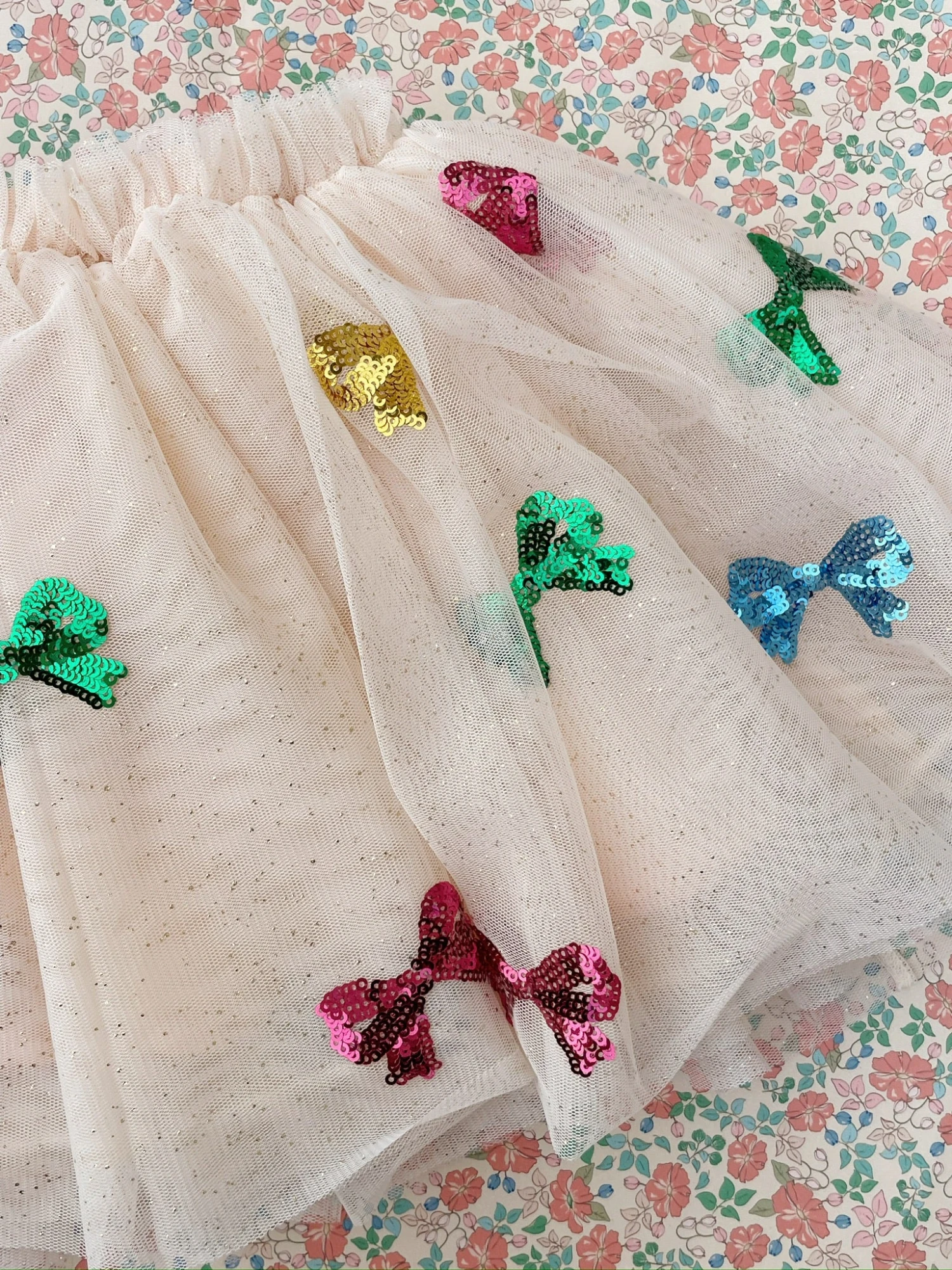 Jupe volumineuse en tulle avec doublure en coton doux et ceinture élastique. Broderie à paillettes.