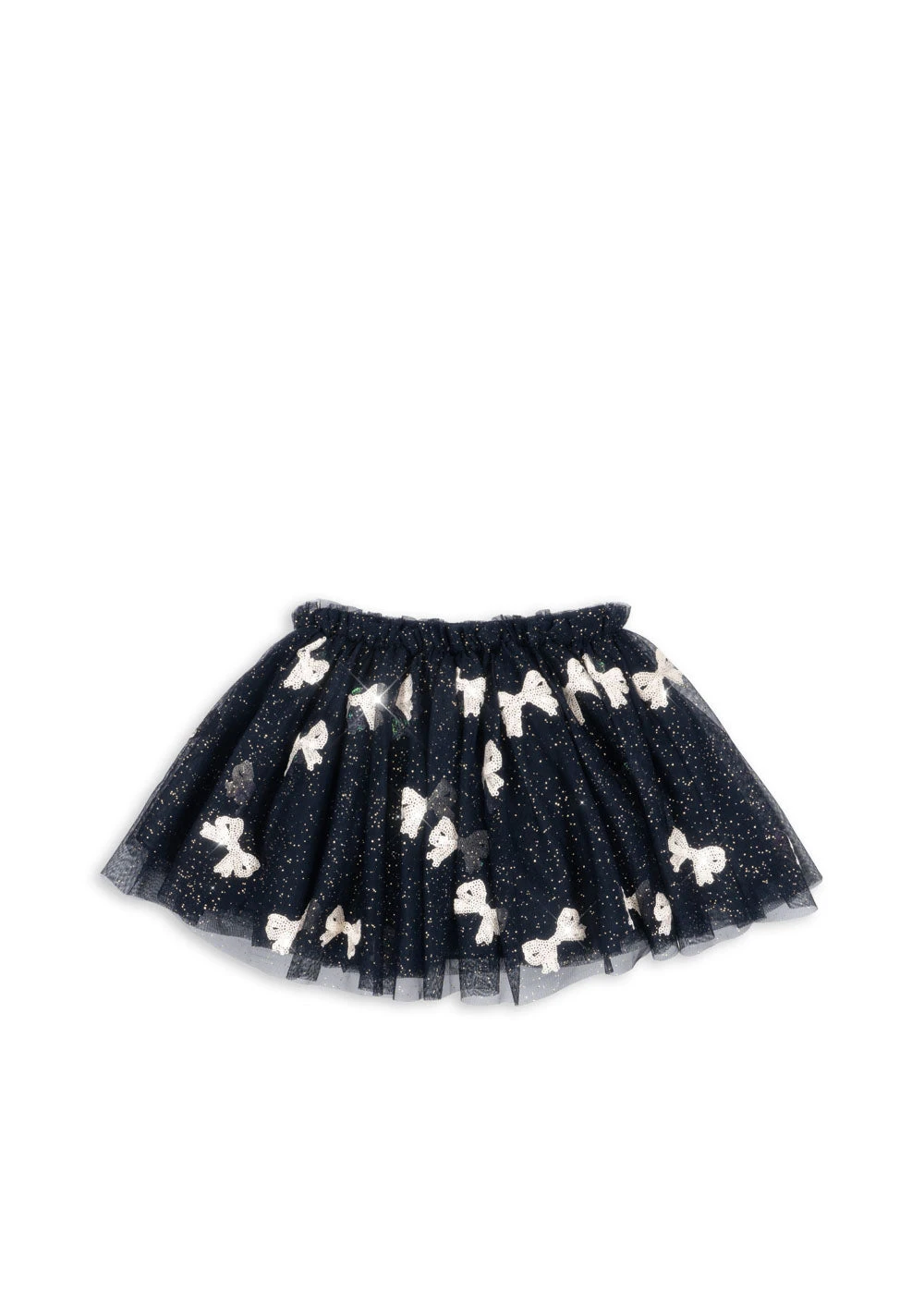Jupe volumineuse en tulle, doublée de coton doux et dotée d’une taille élastique. Ornée de paillettes.