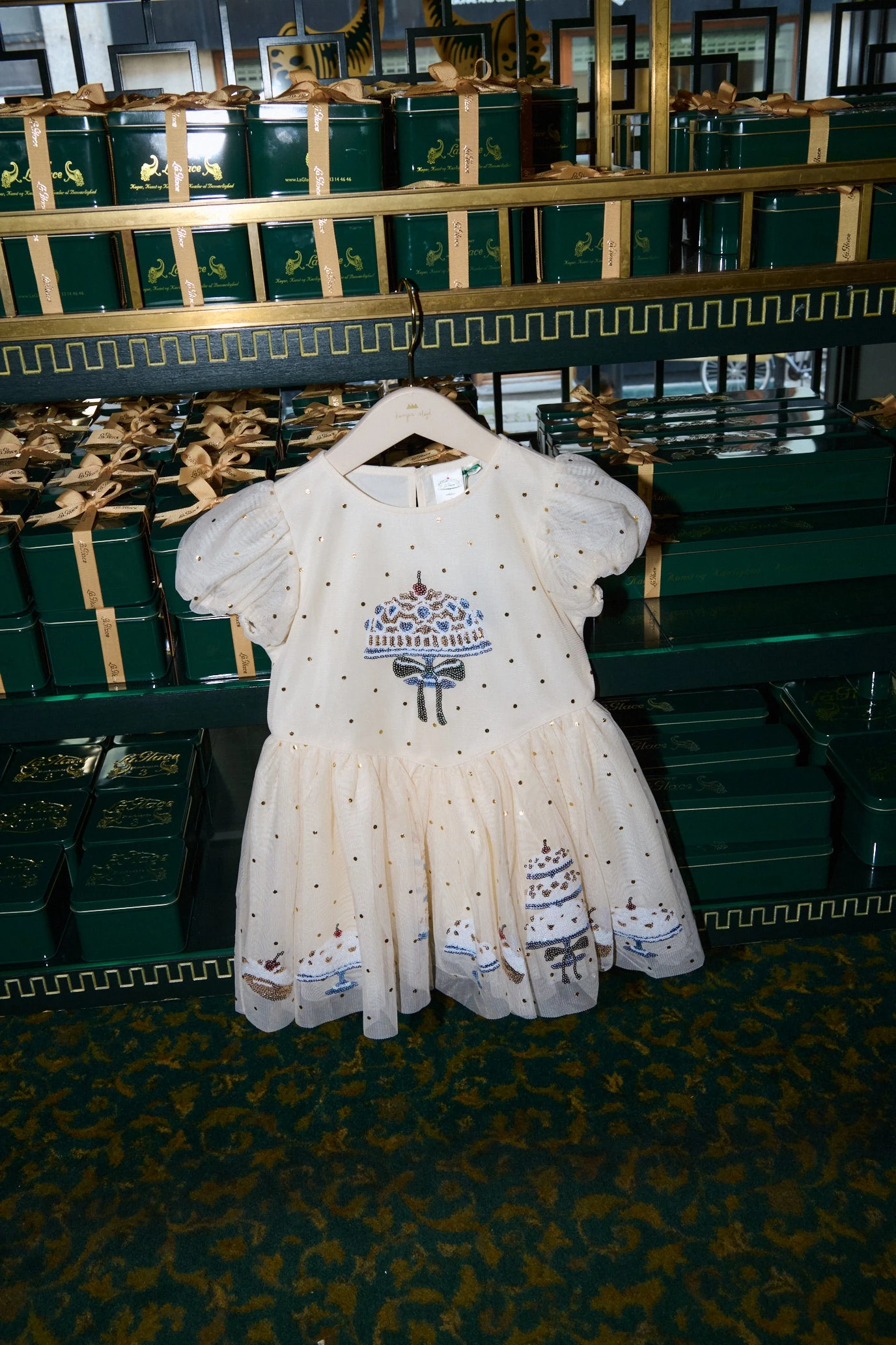 La robe présente une coupe légère avec une jupe superposée qui ondule et se balance lorsque vous jouez et dansez. Elle est ornée de pois dorés et de somptueux motifs de gâteaux à étages en sequins brillants pour une touche finale parfaite.