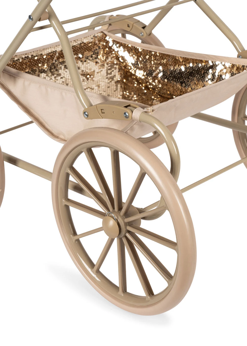 Un véritable modèle Konges Sløjd original : notre landau de poupée au style vintage est doté de quatre grandes roues, d’un tissu matelassé doux, de bords festonnés délicats et d’un matelas. Il est équipé d’un panier de rangement moelleux sous le siège. Le châssis est en métal et doté de poignées souples et moelleuses pour une prise en main facile.