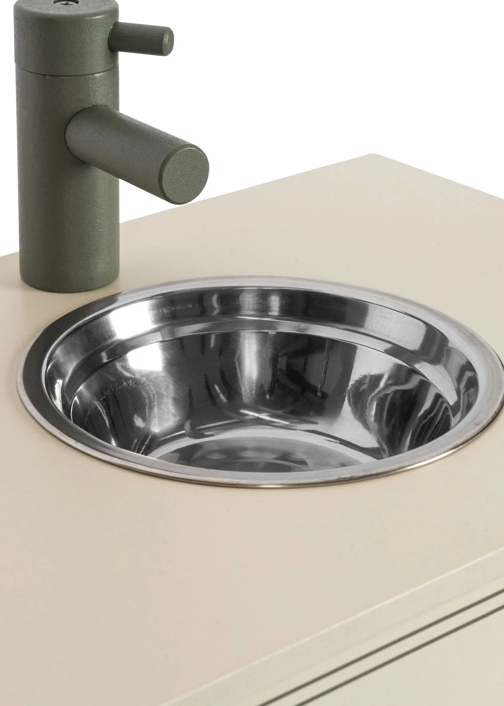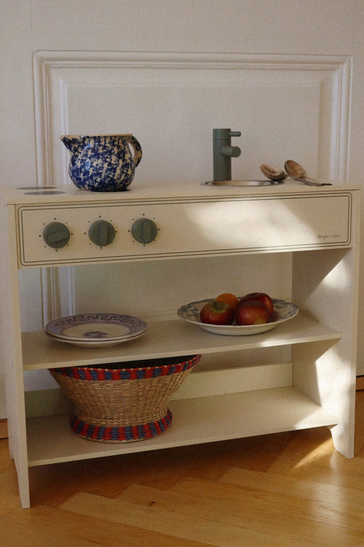 Bienvenue dans ma cuisine ! Voici tout le nécessaire pour préparer de petits plats : une cuisinière, un évier, un robinet et des étagères pour tous vos ustensiles.