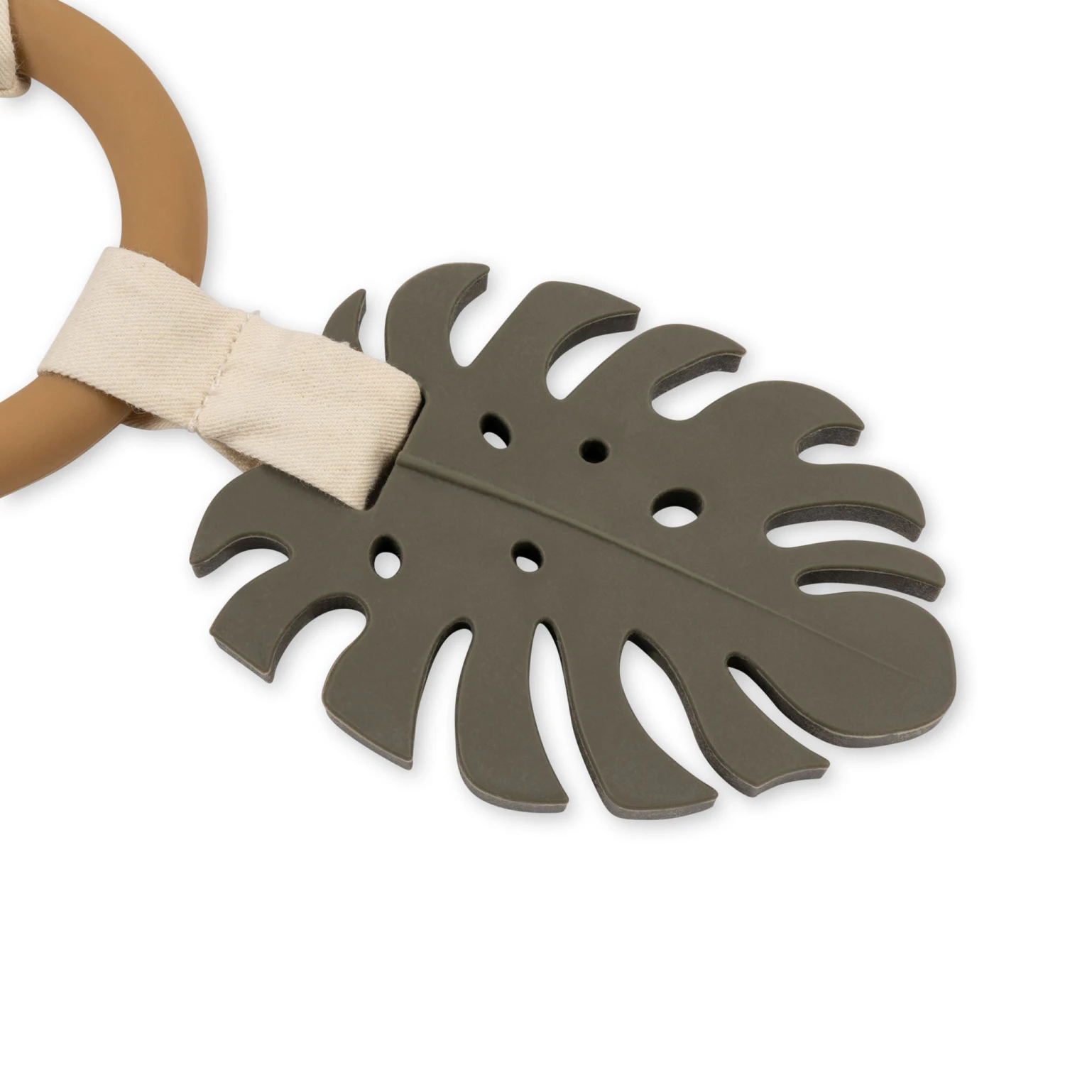 Il y a un anneau en silicone sur lequel sont glissées beaucoup de choses : une petite feuille spongieuse à mâcher, des plaquettes pour jouer, un miroir souple avec un dinosaure brodé à l’arrière, un petit dinosaure avec une clochette à l’intérieur qui sonne lorsqu’elle est secouée et un dinosaure avec un ventre qui craque quand on le touche, le tout pour stimuler les sens de votre bébé.