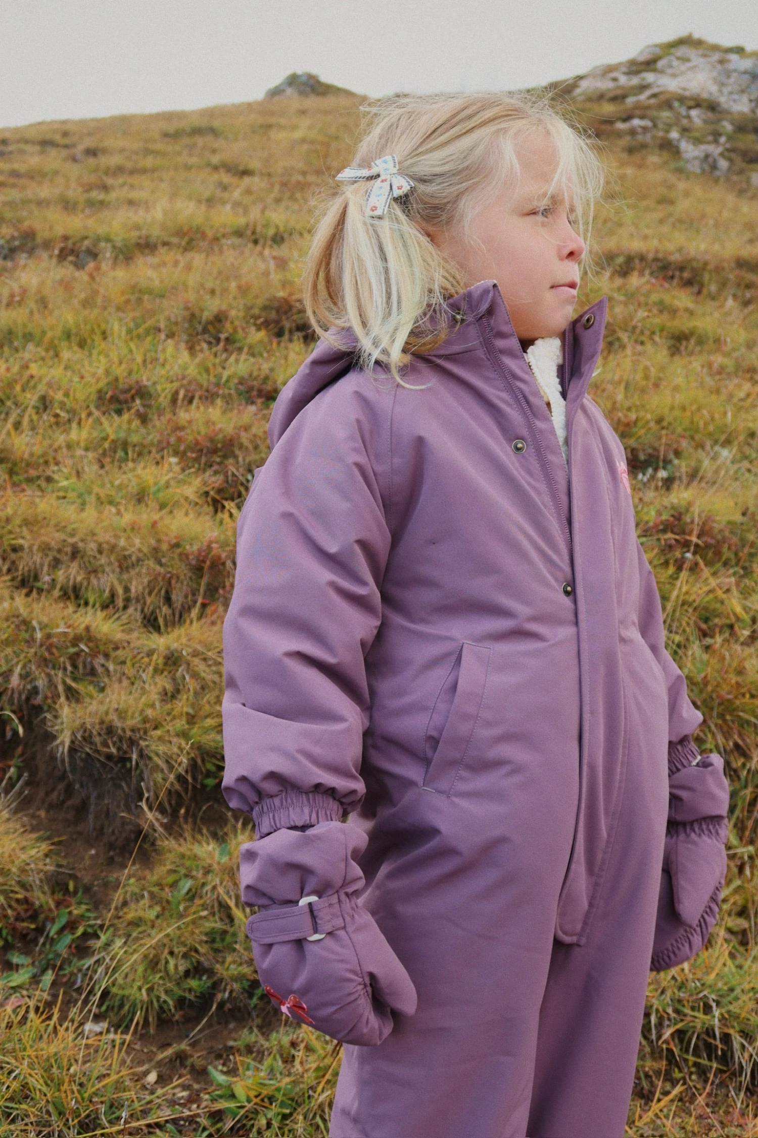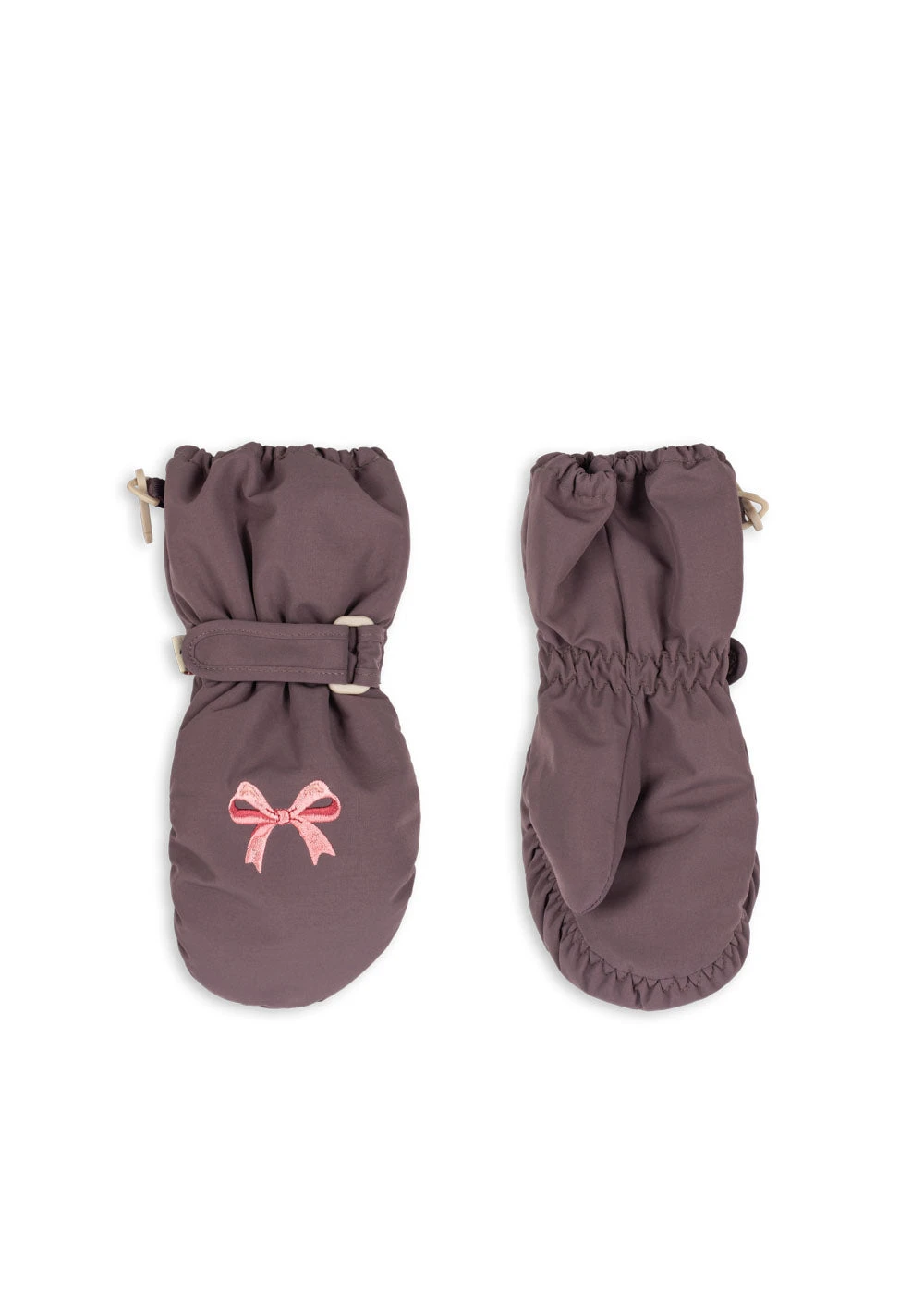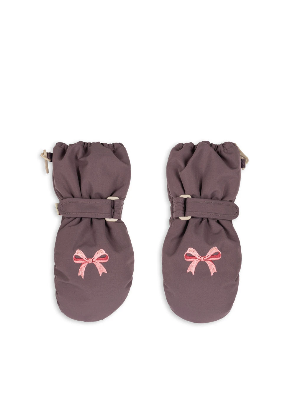 Moufles de neige déperlantes avec une doublure en polaire douce. Présente des poignets ajustables et un double crochet à pression pour attacher les moufles à la veste.