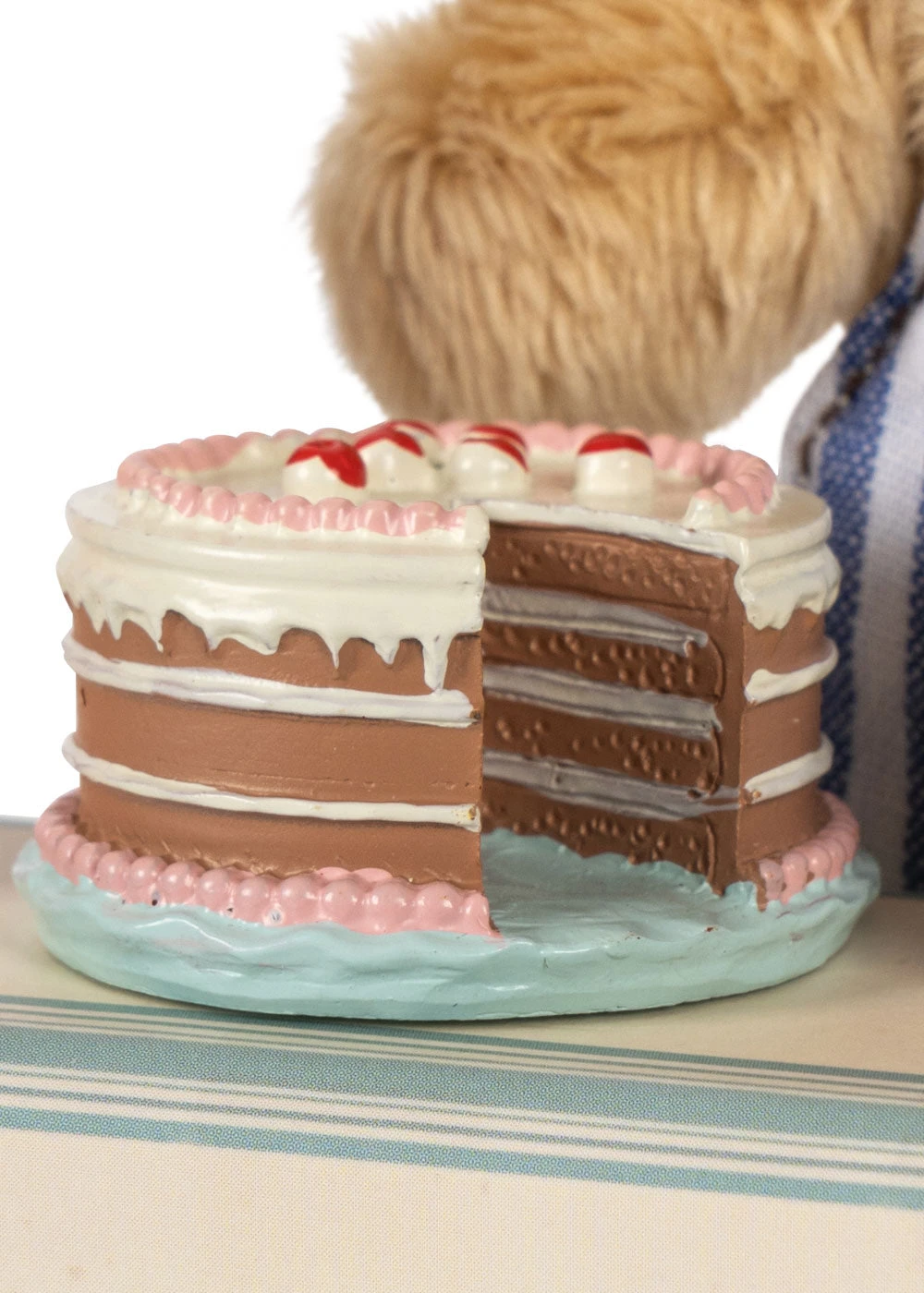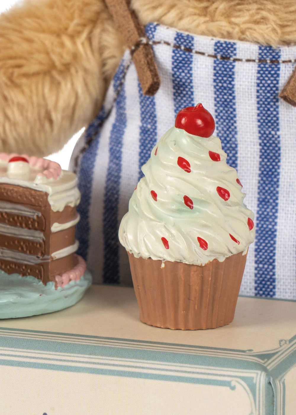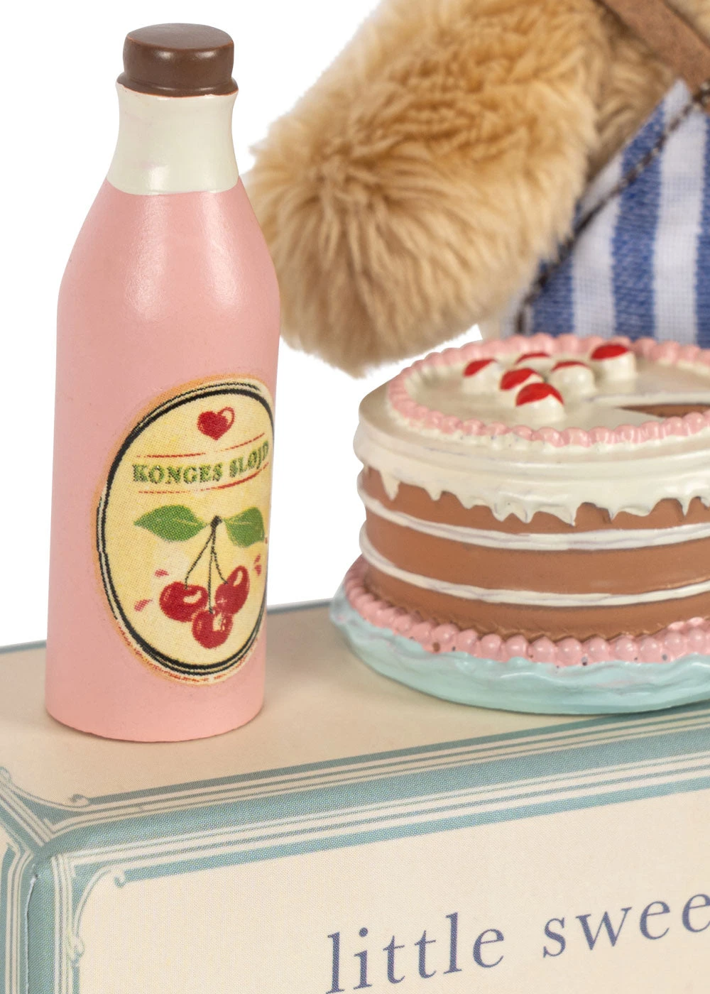 2 petits gâteaux, 1 bouteille, et 1 petit ourson avec tablier.