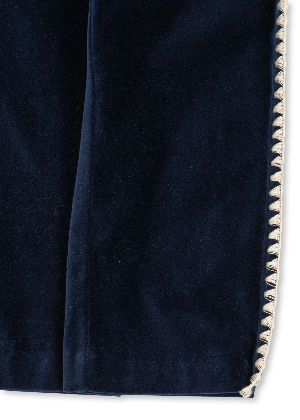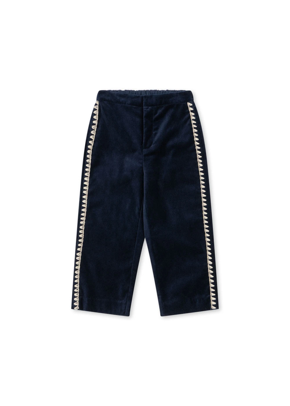 Pantalon de costume en velours doux aux détails classiques et surpiqûres contrastées blanches sur les côtés.