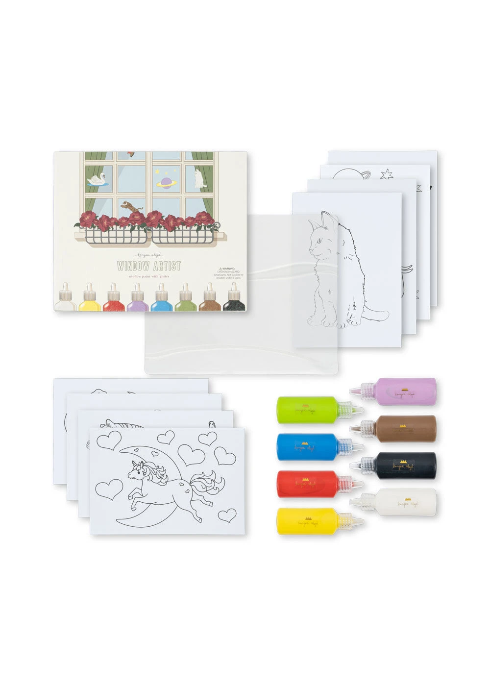 Ce coffret créatif comprend huit peintures pour fenêtres de différentes couleurs avec des paillettes, ainsi que huit feuilles de papier à dessin, pour des créations parfaites.