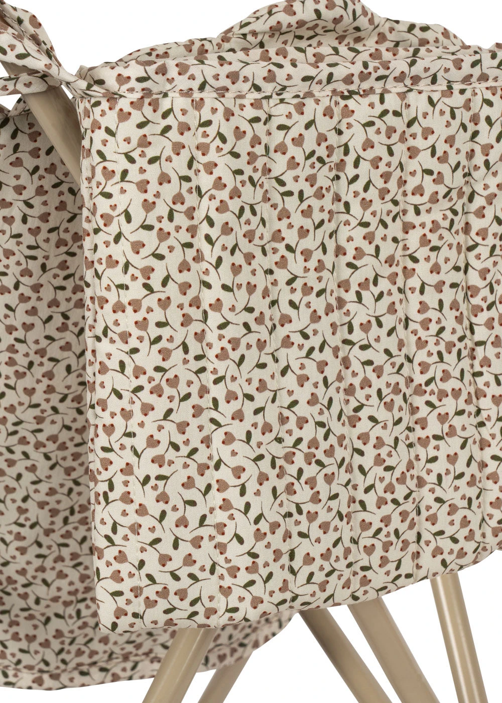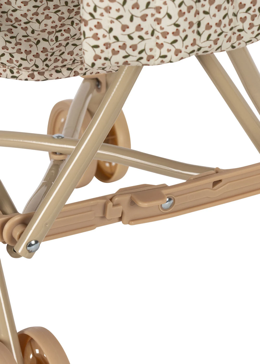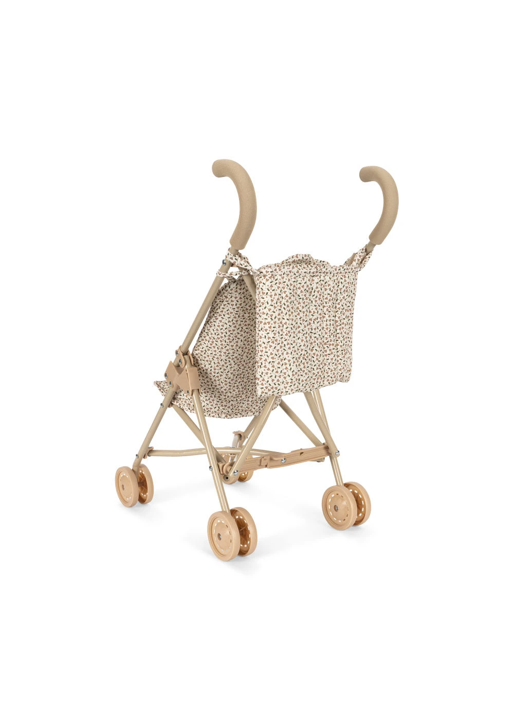 Poussette pour poupée conçue avec un harnais, un sac de transport et des roues doubles au bout des quatre pieds pour plus de stabilité.