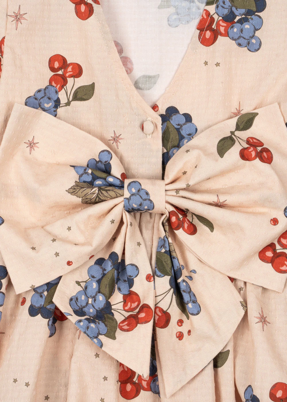 Robe en coton doux, légèrement cintrée et jupe ample à volants. Dos échancré, boutons recouverts de tissu et grand nœud.