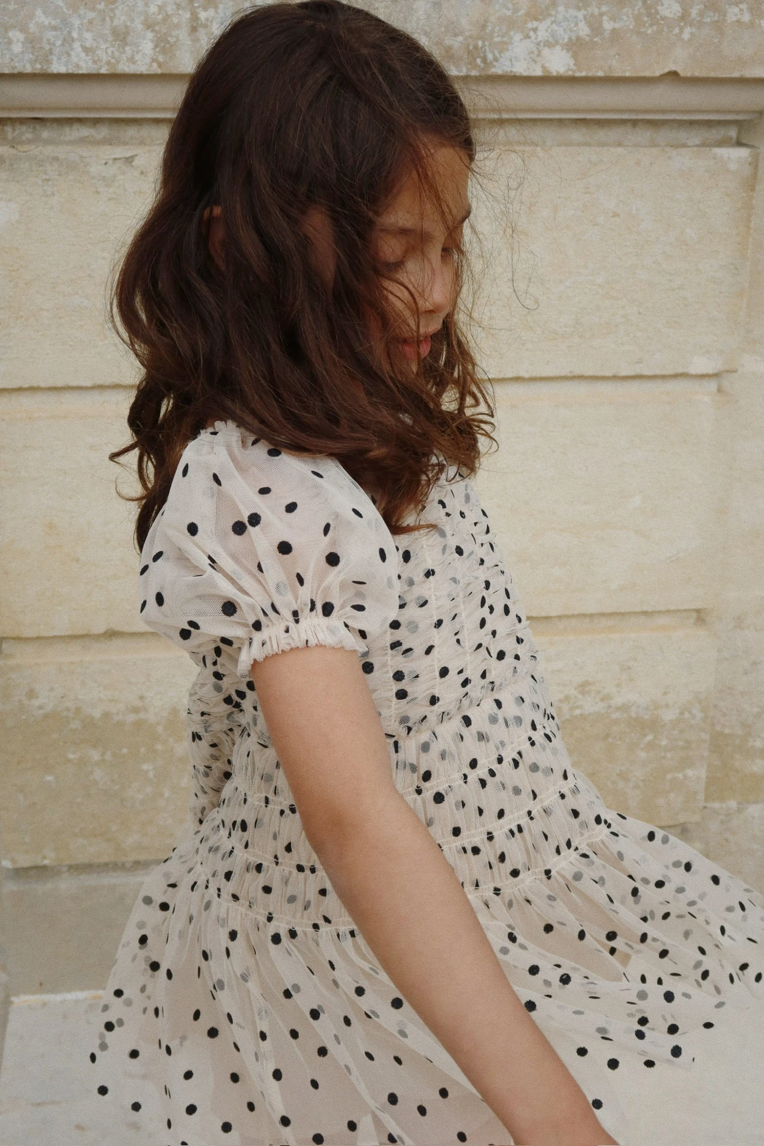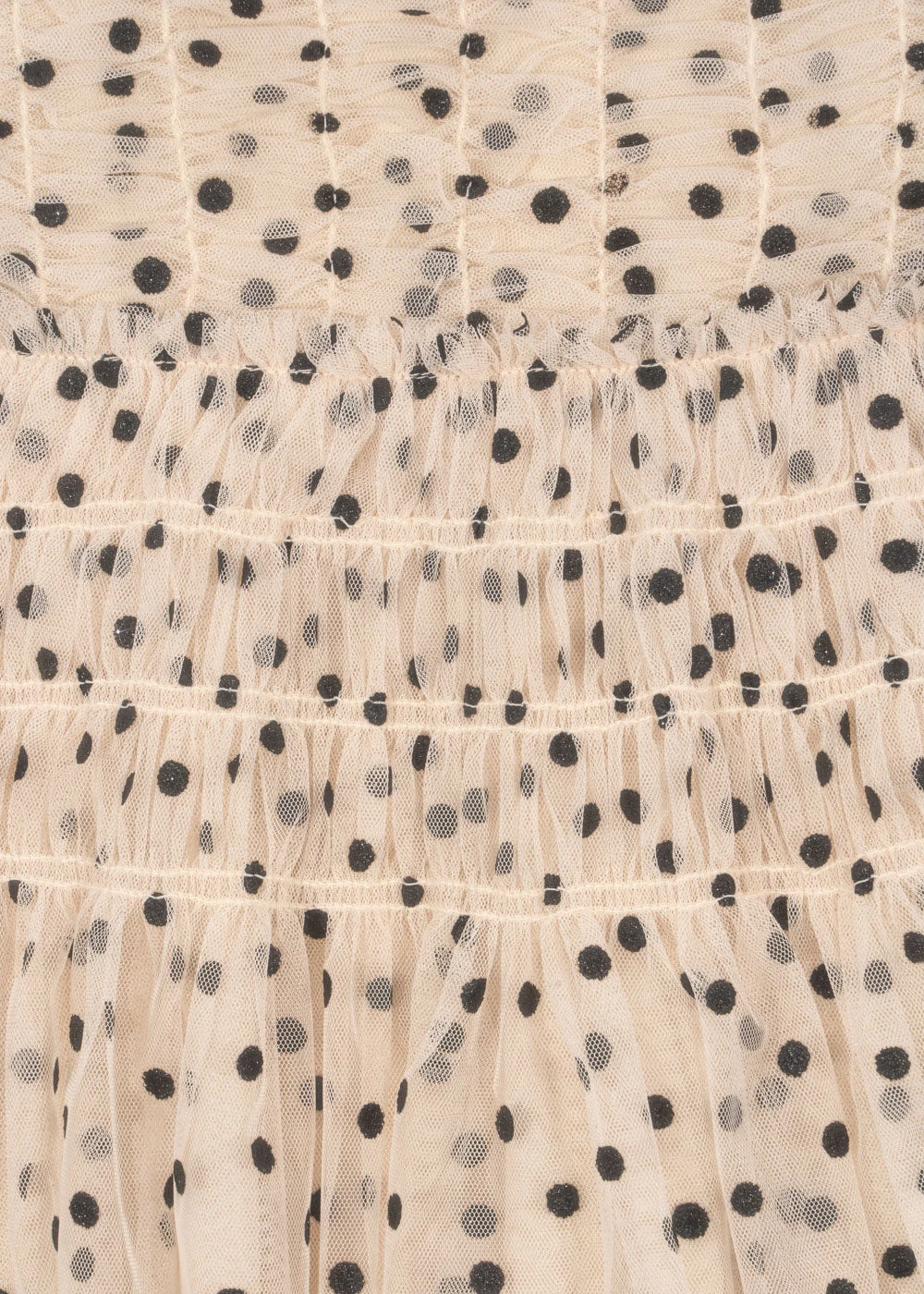 Robe à smocks en tulle. Conçue avec des manches courtes bouffantes et des poignets élastiques.