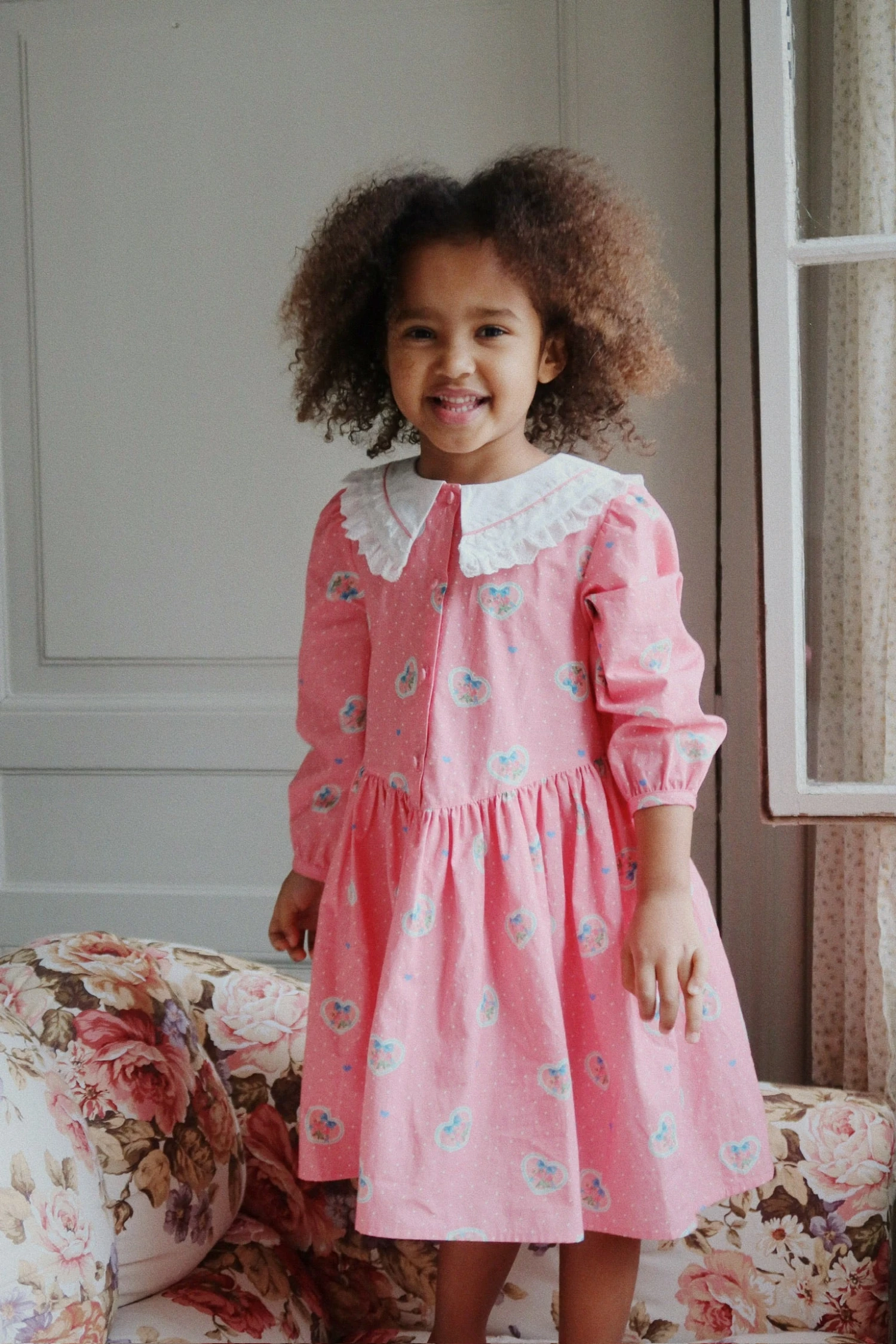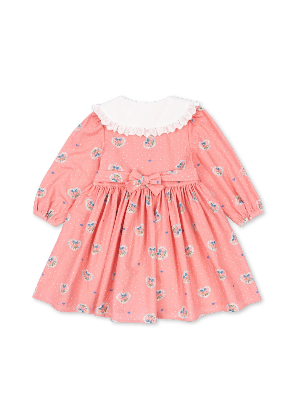 Robe détaillée avec un col rond en dentelle, une jupe évasée et des manches bouffantes. Dotée de boutons recouverts de tissu sur le devant et de bretelles cousues qui se nouent dans le dos pour un ajustement parfait.