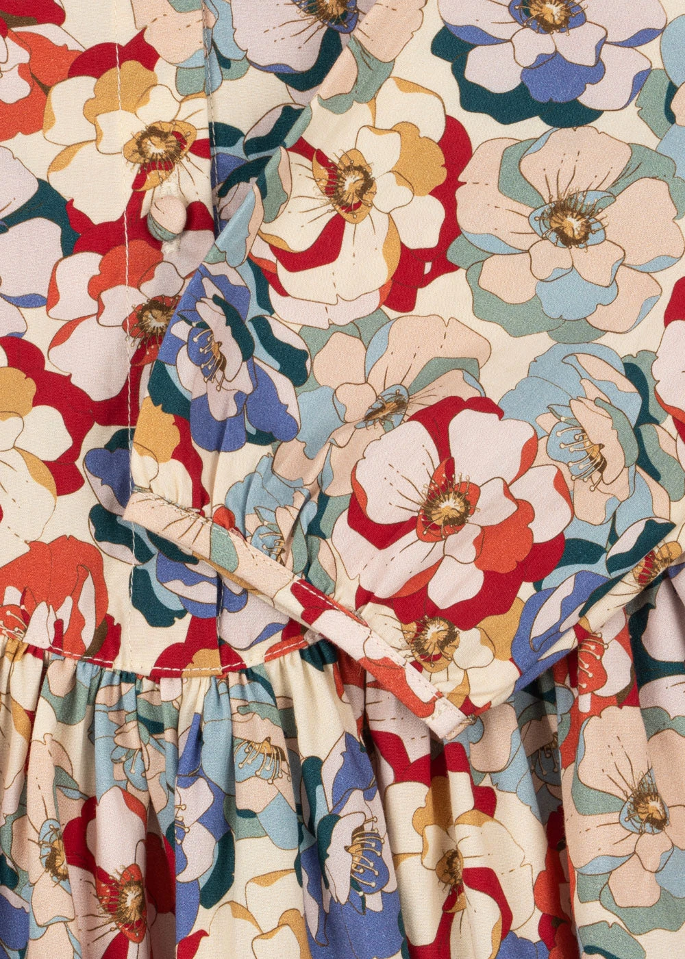 Robe détaillée avec un col rond en dentelle, une jupe évasée et des manches bouffantes. Dotée de boutons recouverts de tissu sur le devant et de bretelles cousues qui se nouent dans le dos pour un ajustement parfait.