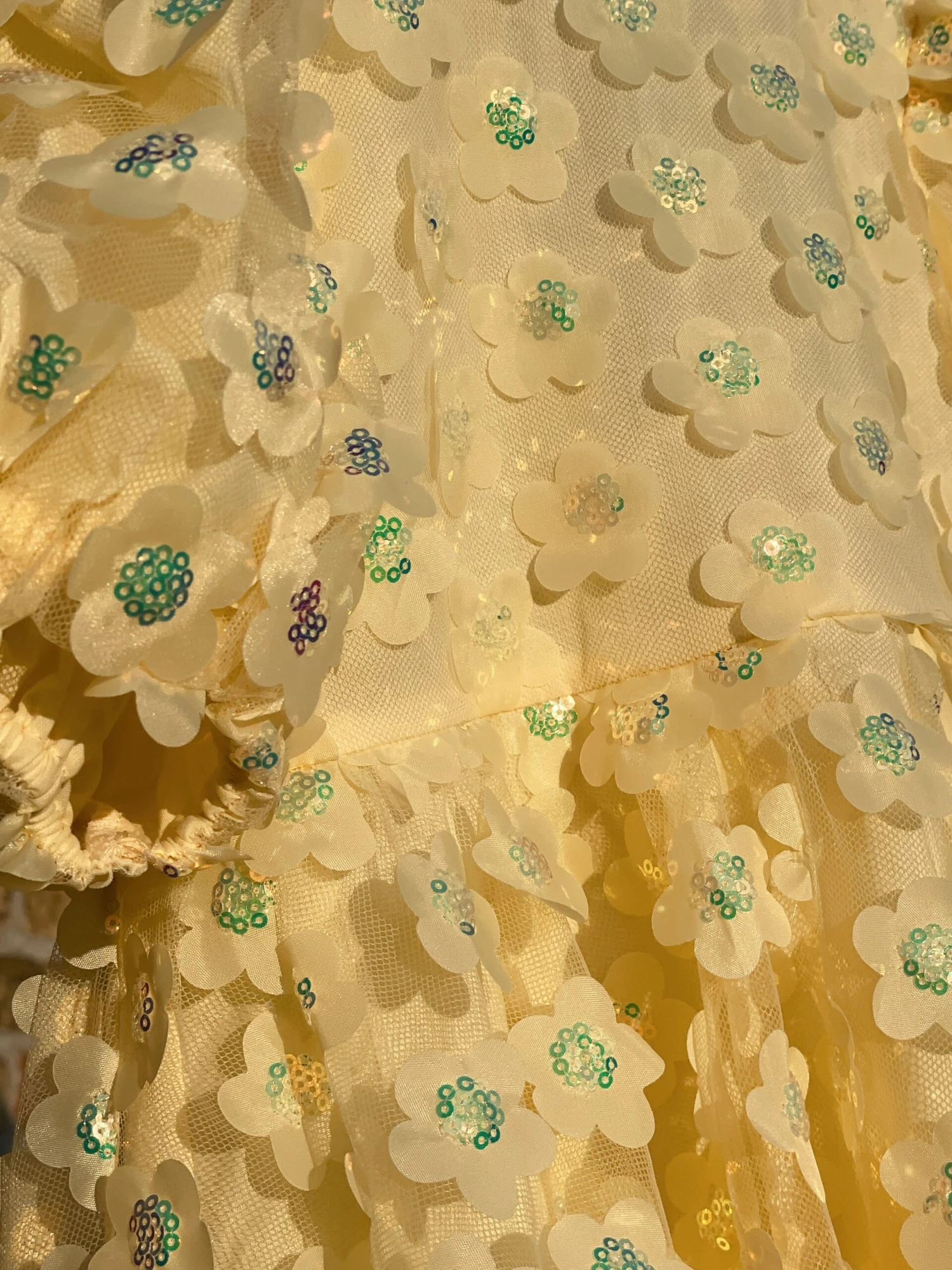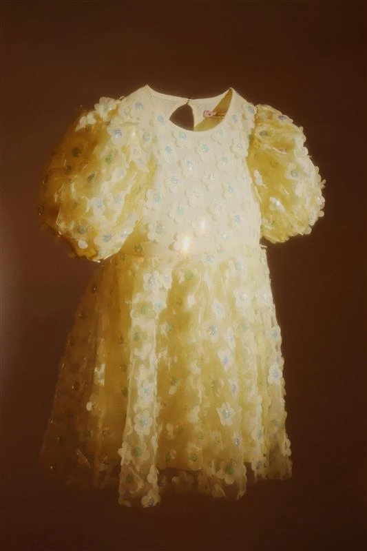 La robe idéale pour célébrer Pâques : notre robe Sally en tulle léger jaune doux, ornée de jolies manches bouffantes et de fleurs en sequins. Doublée de coton tout doux.