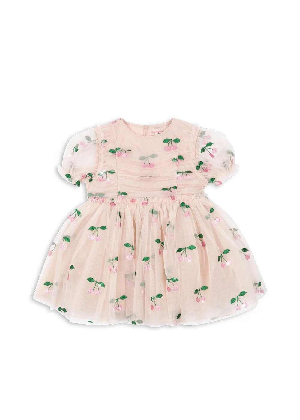 La robe Tullie présente des manches bouffantes, un corsage froncé en tulle transparent et une jupe volumineuse.
