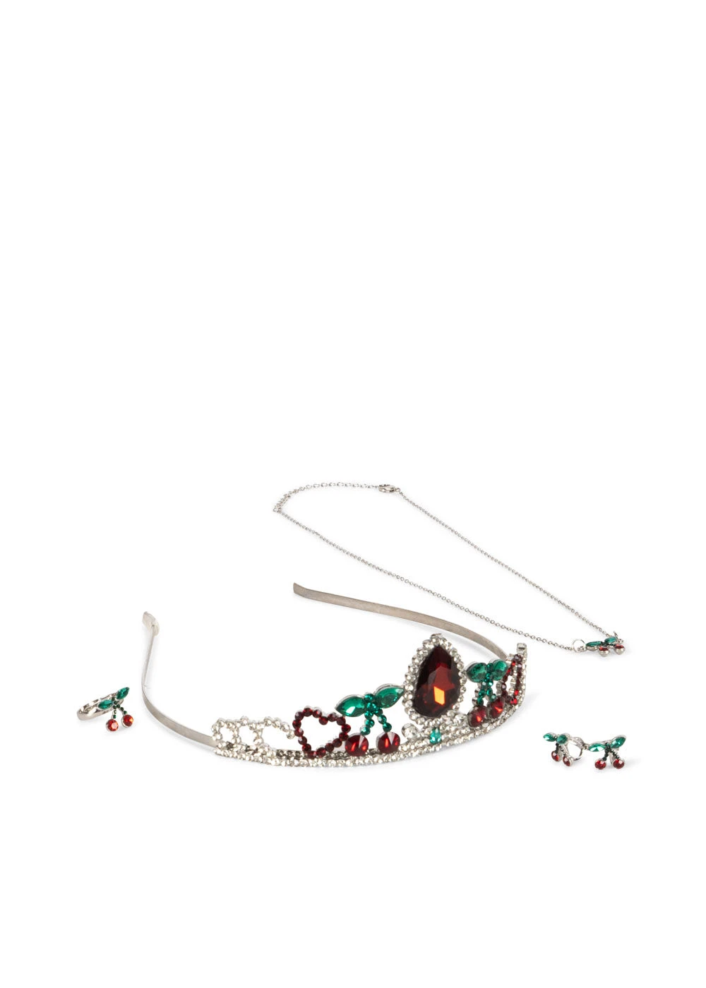 L’ensemble comprend une couronne, des boucles d’oreilles à clips, un collier et une bague réglable.