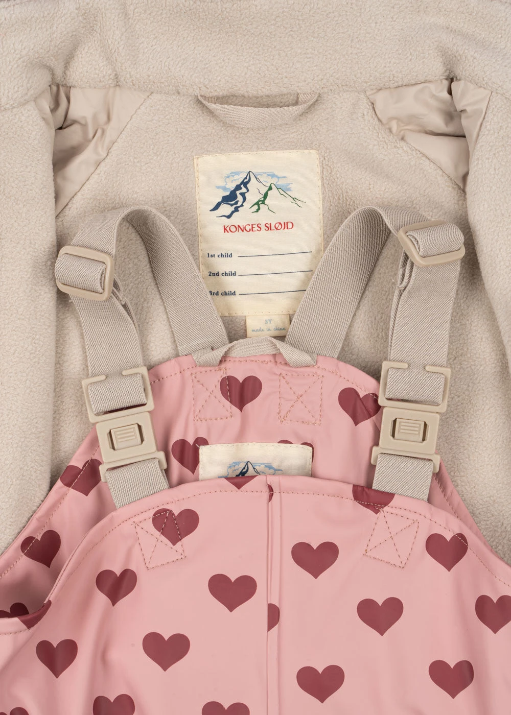 Notez : Pour les tailles jusqu’à 4 ans, tous les pantalons de pluie sont conçus avec des bretelles. Pour les tailles 5-6 ans et plus, les pantalons de pluie comportent une taille élastiquée, facile à enfiler et à retirer.