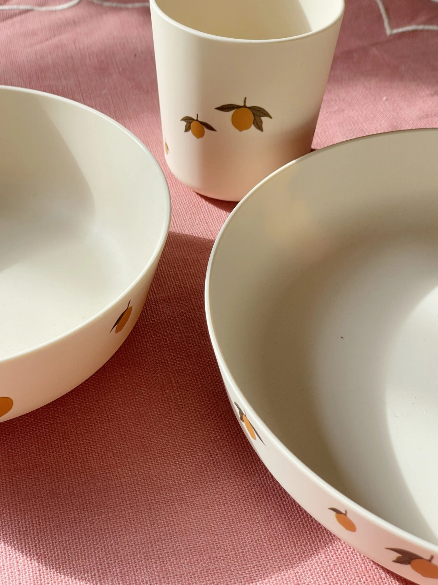 Assiette : H : 3,55 cm x P : 19 cm, Bol : H : 4,35 cm x P : 14,5 cm, Tasse : H : 7,5 cm x P : 7 cm, Couverts : L : 2,5 cm x L:13,5 cm x P : 0,5 cm