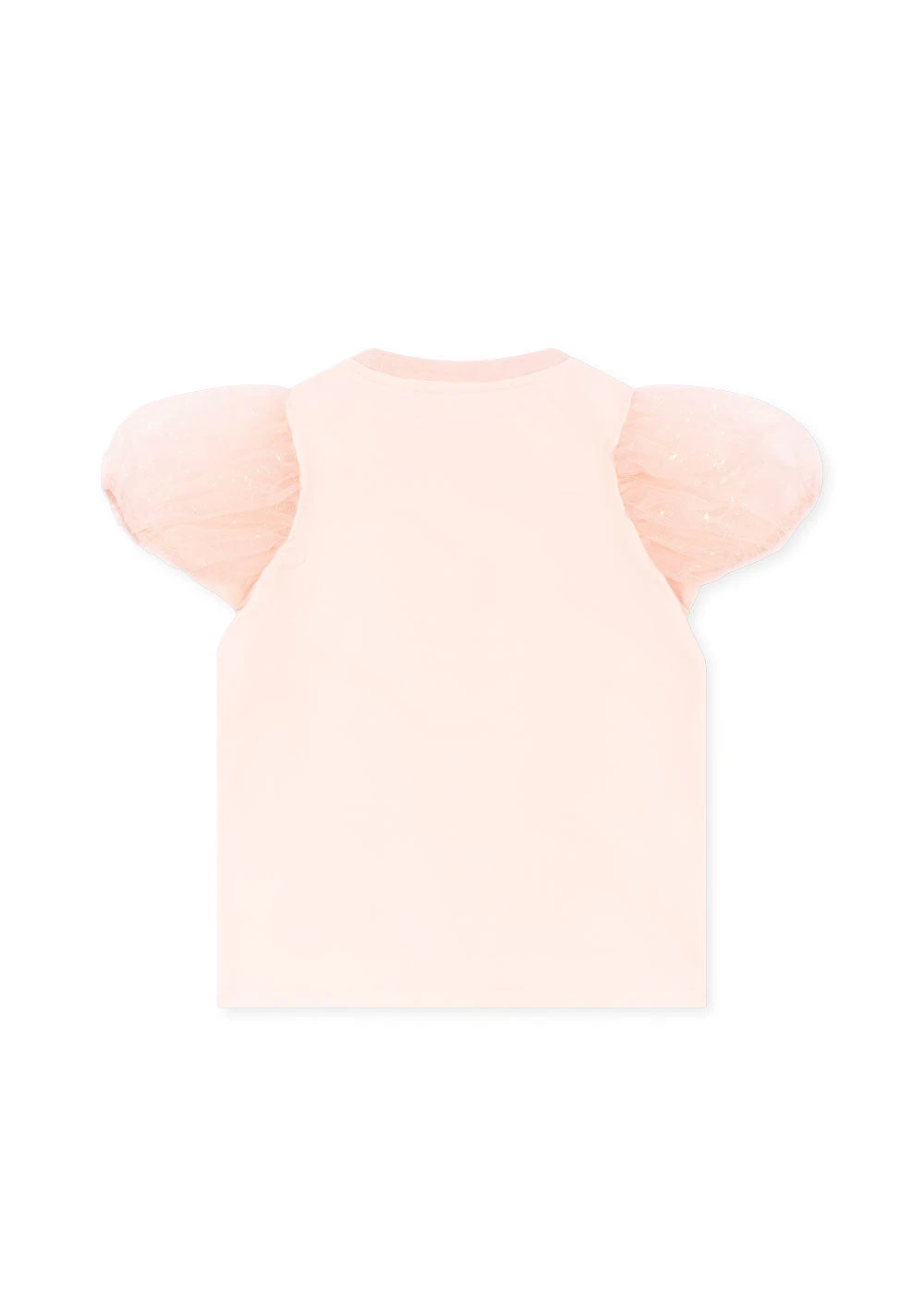 T-shirt ballerine en coton conçu avec des manches bouffantes en tulle ornées de paillettes et de sequins